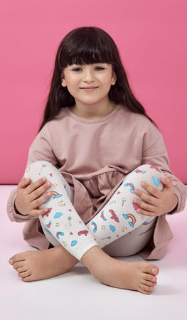 גרביון ילדות אטום ללא כף רגל בצבע קרם בהדפס אייקונים צבעוניים