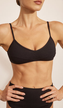 טופ ביקיני שחור בגזרה מחמיאה, עם מחשוף רך ורצועות דקות מתכווננות. עשוי בד וופל נעים עם בטנה מלאה, כולל ריפוד נשלף לעיצוב מותאם ונוח.