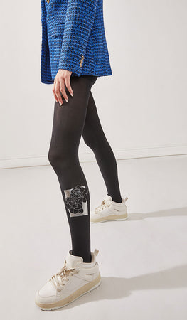 גרביון נשים אטום בצבע שחור הדפס ורדים כסופים