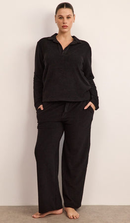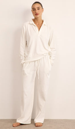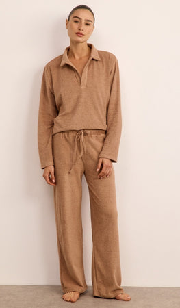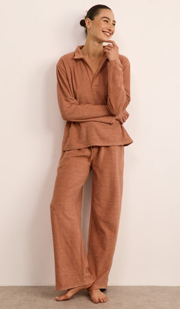 סט נינוח מבד בוקלה רך במיוחד, כולל חולצת פולו ארוכה ומכנסיים מתרחבים עם גומי וכיסים צידיים. מתאים לשהיה בבית, ליום נינוח בחוץ וגם לטיסה